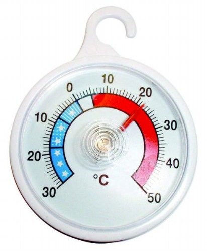 Fridge thermometer and freezer thermometer combined. This easy to read fridge or freezer thermometer has a Ø52mm dial, indicating temperature over a range of -30 to 30°C in 1°C divisions and incorporates colour-coded zones.The fridge freezer has an ABS case incorporating a plastic hook to hang from a shelf.